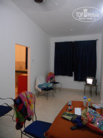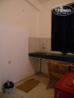 В номерах (достаточно просторных) мебели минимум (в нашем номере только металлический шкафчик, стол, 4 стула, телевизор, у других еще и трюмо было, и диванчик - в корпусе С). Душ - из стены, на пол, после мытья в душе на полу остается большая лужа некоторое время. Водились муравьи, если долго не прибираться, забегала ящерка, первые дни напустили комаров (с открытым балконом и светом), другой живности не встречали в номере, особо она нас не напрягала.