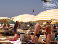 Пляж хорош тем, что там песок, песчаное дно. Кстати, на этом пляже работает самый придурковатый и жалкий человек в отеле-бич бой Изи. Единственный человек в отеле, который делает хоть ЧТО ТО. Трет лежаки, втыкает зонтики, через 20 минут он уже у бассейна вытерает той же тряпкой что и лежаки-стаканы, разливает коктели, тягает тележки с едой. Дайте ему хоть доллар-его реально жалко. Самый прико пляжа состоит в том, что на него заходят все, кому не лень, кто то по пляжу, кто то через склон. Моются и купаются под душем отеля, вся мыльная пена от этих бомжей стекает вначале в речушку(в ней же квакают лягушки, стоит тина) и далее прямиком в море. Была даже заменчены бомжи, влезающие на пляж. Кроме платно туалета на пляже ничего нет, даже за водой придется идти через трубу.Цены в кафешках составляют 4 $ за бутылку эфеса.
