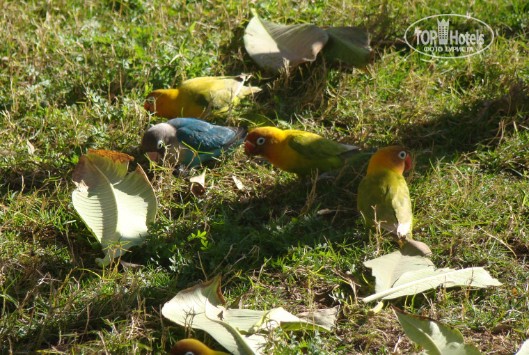 Территория не очень большая, но и не маленькая. Ухоженная, зеленая. У ресторана на пляже живут попугайчики.
