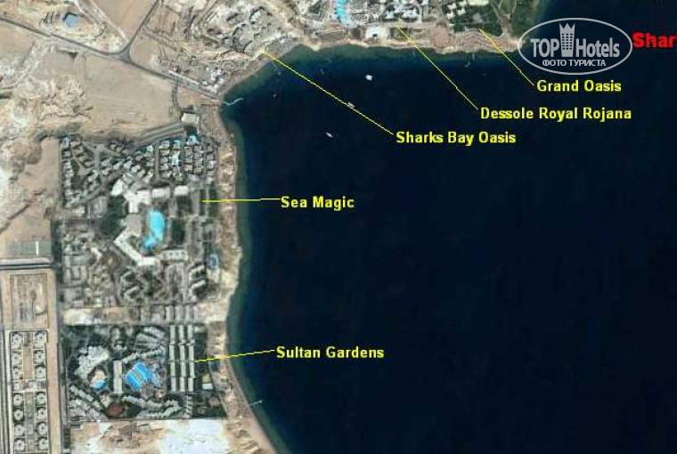 Отель расположен в узкой полосе между двумя отелями: Sultan Gardens и Sea Magic (см. фото (правда старое) - на нем видны четыре недостроенных корпуса, расположенные ближе к береговой линии)