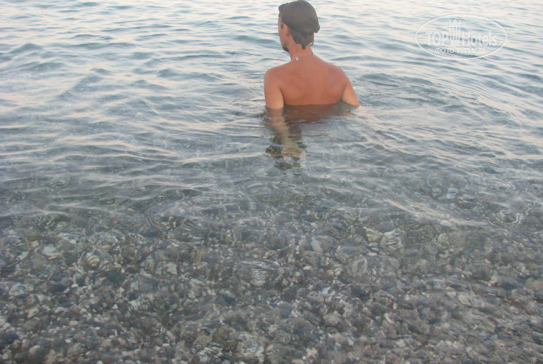 Море чистое. Глубина наступает довольно быстро - метров через 5-7 уже "с головкой". Но оказалось, что при спокойном море этих 5-7 метров детям вполне хватает, а если в круге или нарукавниках - то без проблем и дальше. Большие волны были только один раз за 10 дней (мы с женой на них "оторвались", чуть ли не единственные на всём пляже...) - в остальные дни было море спокойное.
