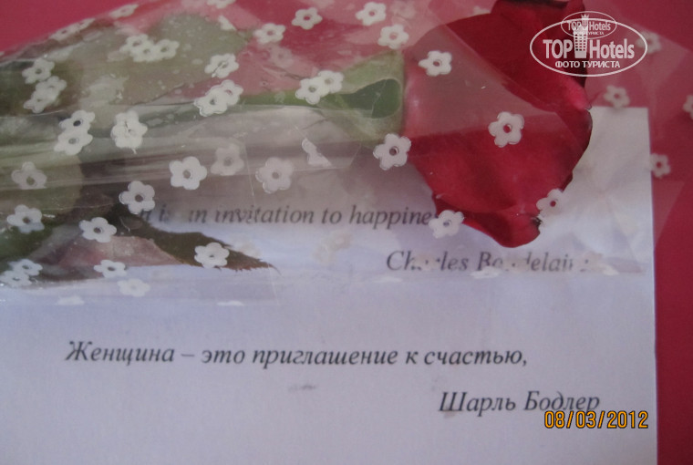 1.Разместили сразу же,хотя приехала в 11 часов утра,номер с видом на море в вилле скорпон. Номера очень хорошие. Особенно радует кровать и постельные принадлежности(очень удобные).Номера,по сравнению с прошлым годом убирали очень хорошо. Если оставляла 1 долл,то крутили лебедей и приносили цветы. Если не оставляла,то убирали так же хорошо,но лебедей уже не крутили.