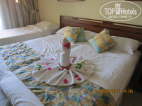Расселение и номера: Приехали в отель почти в 19 часов, на ресепшене нас встретили коктелями и улыбками, мы быстро заполнили анкеты, нам выдали ключи, браслеты и на мини-каре отвезли к нашему номеру. Поселили нас в 4 корпусе на 2 этаже. Номер чистый, уютный, мебель конечно не новая, но все: закрывалось-открывалось и не скрепело, вся техника исправно работала. В номере: гладильная доска, утюг, мини-бар(заполнен, по системе "ультра" первое опустошение бесплатное, но только безалкогольных напитков, шоколадки и пиво - за деньги, далее мини-бар пополняется только простой водой), телевизор,весы, чайник( чай, кофе, сахар, чашки, все пополняется ежедневно, чашки моются), фен, часы с будильником, в ванной все необходимые принадлежности: мыло, гель для душа, шампунь, кондиционер, лосьен для тела и шапочка. Уборка, смена белья в номере ежедневно, полотенца меняли если бросишь его в ванну или на пол. К уборке притензий у нас не было, убирали хорошо, протирали полы, пыль и пятна со столов, заправляли кровати, мыли чашки, стаканы, меняли полотенца.