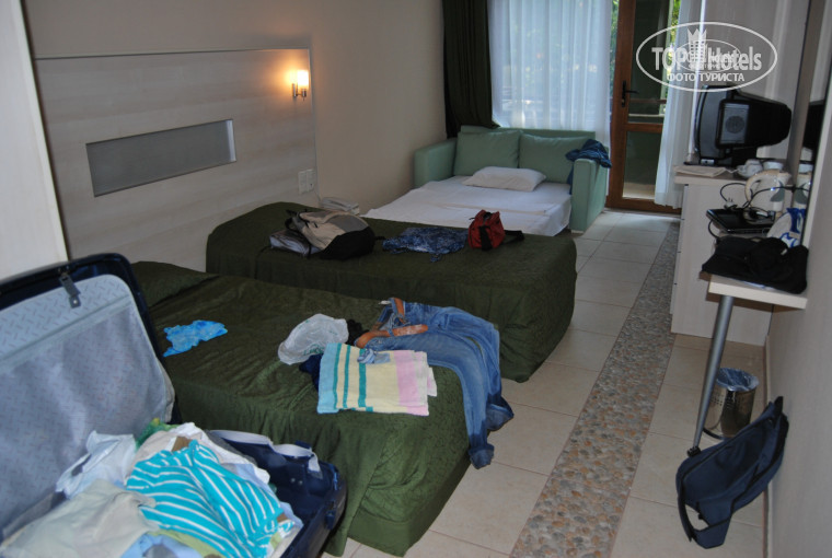 Теперь о плохом. Это номер. Ужасный, сырой, мрачный подвал. Таких номеров 7 или 8 и находятся они в цоколе. Кафельный пол, между плитками мураравьиная тропа. Вобщем жуть. При этом на нашу семью из 3 взрослых и 1 ребенка там было 2 односпальные кровати и небольшой диванчик. Дополнительное место даже некуда было ставить, настолько маленький был номер. Уважаемые туристы! Обращайте внимание, чтобы в ваучере был прописан именно тот номер, который Вы оплатили. У нас он был прописан не совсем точно, поэтому мы и очутились в такой ситуации.