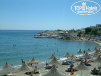 Пляж состоит из 2-х частей. Напротив Village – бетонная платформа, сход по лестнице, напротив Mare – мелкая галька серого цвета. Этот пляж расположен в бухте, поэтому купаться там приятно и безопасно. В этой же бухте центр водных развлечений. На пляже – спасатели, водная поверхность разграничена бакенами. Море чистое и спокойное. На пляже чисто, лежаки нормальные. Единственная проблема – до обеда они практически все заняты. Поэтому, если хотите лежать на лежаке не у бассейна – занимайте лежак заранее, но нам этого было не нужно т.к. приятнее всего было сидеть в баре совмещая одно приятное с другим приятным.