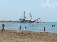 Пляж: отличный пляж, вход очень плавный, без камней, до глубины метров 50 нужно идти , но зато вода лучше прогревается (что в мае очень актуально). На пляже бар под навесом, туалет, душевые. Питание на пляже не организуется, только к вечеру накрывали не большой стол с фруктами и чуть сладкого, но совсем мало, так что чтобы перекусить нужно возвращаться в отель. Пропустить обед навряд ли получится потому что назогоравшись и накупавшись, ложишься на шезлонг и до тебя начинают доноситься запахи из пляжных баров других отелей, которые находятся совсем рядом с вашим пляжным баром, а там готовятся разные закуски, так что урчащий желудок заставляет подниматься, одеваться, и идти обедать в отель.)))))