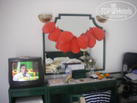 Номер достался на втором этаже в 16 корпусе. Номер средних размеров, две больших односпальных кровати, большой шкаф-купе, диван, журнальный столик, мини-бар, сейф, телевизор, индивидуальный кондиционер. В ванной комнате - душ, фен, огромное зеркало, есть всё необходимое. Мебель и сантехника не новая, но в хорошем состоянии. Есть довольно просторный балкон. В минибаре по 2 пол литровых бутылки воды на человека в день.