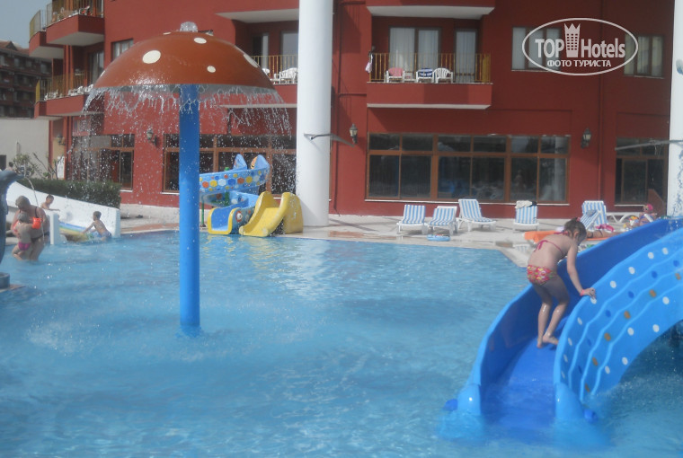 Территория отеля. То что мы были поражены территорией отеля это понятно, но также другие гости, с которыми мы общались, замечали, что такой большой и разнообразной территории они еще не видели! Отдохнуть на территории можно было на любой вкус: те, кто хотел отдыха в спокойной обстановке, выбирал небольшой бассейн рядом со SPA-центром или пляж у моря, те, кому нравятся тусовки и громкая музыка, могли найти все это у большого бассейна. Можно было без проблем загорать на лежаках как возле бассейна (под зонтиками, тентами или просто так), так и на мягких лужайках. Для младших детей есть отдельный безопасный бассейн с небольшими горками, для детей постарше и взрослых есть 6 водных горок различной конфигурации. Вода в бассейнах комфортная, чистая, хлоркой пахнет неявно, с лежаками особых проблем не было, несмотря на то, что некоторые гости имели нехорошую привычку занимать лежаки полотенцами и личными вещами, а самим ими (лежаками) не пользоваться. Также поразила чистота общественных туалетов на территории отеля, несмотря на большое количество гостей, они всегда оставались чистыми и в них никогда не заканчивались туалетная бумага, мыло и бумажные полотенца!