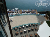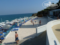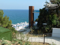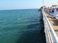 Пляжа нету в принципе, вместо него есть пантон (деревянный настил в 2х метрах над уровнем моря). Вход в море с двух узеньких лестниц , временами приходилось ждать пока разойдётся толпа чтобы дойти до моря. Глубина сразу метр-полтора до ближайшего камня в зависимости от прилива/отлива. На пару шагов дальше – метра два-три и глубже. На камнях в левой части пантона около метра. Если нету большого желания плюхаться в песочке около моря – то такой вариант даже лучше, на сушу выходишь с чистыми ногами да и вообще дна не касаешься. На понтоне есть специальное место для прыжков в воду. От отеля до моря метров 150, из них вниз ещё 50. Для особо ленивых поставили лифт – весьма продуманное решение. Песочек есть на террасе над понтоном – меленький и беленький, но уже за пару недель загаженный окурками.