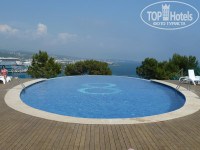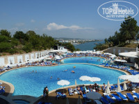 И в самом деле небольшая (если говорить только про сам отель, не включая смежный аквапарк), и большую её часть занимают два бассейна. Там где шла стройка травка только пробивается – таких площадей немного, вокруг весьма красивый хвойный лес. Есть хороший амфитеатр для проведения шоу. Внизу, около моря, пантон (на знаю как это правильно назвать) над морем где-то на 50-60 лежаков. В общем побродить негде, но и тесноты или проблем со свободными лежаками я не заметил. Скорее всего половина народа днём бродит по аквапарку, поэтому в самом отеле тесноты не наблюдается.