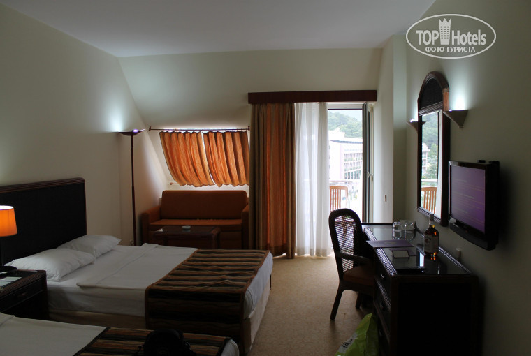По приезду нам сразу же дали карточки от номера в основном здании на 3 этаже, номер с видом на горы очень понравился, всё чистенько и всё работает! Никаких нареканий по поводу размещения нет, единственный маленький минус... это wi fi который якобы должен быть в номере, мне так и не удалось к нему подключиться на 3 этаже, потому что скорость была очень маленькой, приходилось спускаться на ресепшн, там всё ОКе! Но мы приехали отдыхать, а не в интернете сидеть, это так для информации.