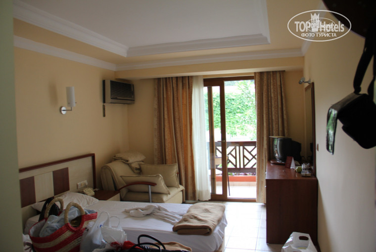 В главном корпусе номера с ванной, с мрамором, с паркетом (в домиках плитка на полу, холодно ногам), с телеком плоским, с балдахином над кроватью, большие, сейф без залога, нормально работает (в бунгало надо на рецепшн под залог 20 долларов брать какую фигульку, кот в сейф вставляется в бунгало и только после этого он начинает функционировать), далее в номерах в гл.корпусе шкаф побольше (у нас шмотья было море, нам в мелкий шкафчик в бунгало было даже моих вещей не впихнутЬ, а у меня еще муж был и ребенок с собой ), ну кроме красоты полезностей больше и нет никакой в номерах в гл.корпусе, карточкой пластиковой открывалась дверь, в бунгало ключ обычный был с кассетой для вставки в номере для света и электричества. Кстати, за утерю карточки пластиковой могут снять 15 долларов, не теряйте. У нас 2 раза была потеря, один раз бесплатно поменяли (улыбались как могли всей семьей, второй раз вредный шеф всех турков на рецепшн запросил 15 баксов..) пришлось платить. Хотя уезжая, мы одну карточку сдали, когда пошли оплачивать счета на рецепшн ( за выпитое и записанное на номер) и а вторую можно было бы и не сдавать вообще, никто бы не понял когда мы уехали, так что если с 1ой будет удобно ходить, при потере 2ой, можно и не платить ничего, потом просто сдать только одну, сказав, что вторая пока нужна.