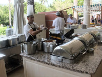 Питание. Больная турецкая тема :) Отличное питание! Питались мы чаще всего в основном ресторане «Меридиан». Утром – мест много свободных, в обед – меньше, на ужин – либо надо идти к открытию, либо часом позже. Количество блюд чуть меньше, чем в тех отелях, где мы отдыхали раньше, но качество выше всех похвал! Неплохие мясные блюда, приготовленные на гриле и обычным способом. Традиционно большое количество курицы и индейки, есть говядина и баранина. Вкусные котлетки. Достаточное количество овощей и зелени. Баклажаны, кабачки, оладьи из цукини (отдельный респект повару!!!), сыр, колбаса, сосиски и салаты… Салаты тоже заслуживают отдельной похвалы! Обычно к салатам с майонезом и сметаной на отдыхе я близко не подхожу! А здесь с удовольствием их уплетала! Очень свежие и вкусные! Вкусные соусы, аджика. Постоянно были какие то закусочки. Из морепродуктов в салатах встречались мидии, креветки, осьминожки, кальмары. Рыба в разных вариациях.. Большой популярностью пользовалось картофельное пюре, картофель фри, спагетти. Вкусный рис. Есть диетический уголок. Очень вкусная выпечка – начиная от всевозможных булочек, пончиков, лепешек с разными начинками и заканчивая хлебом. Да, еще утром были очень вкусные блинчики. Десерты – много и вкусно :) А вот фруктов было мало - в основном яблоки и апельсины. Один раз видели бананы. Клубникой не побаловали ни разу. Но мы особо не переживали по этому поводу. Вышли за территорию отеля и купили на улице. Вино из бутылок (красное и белое). Пиво «Туборг». В ресторане в обед и ужин можно заказать у официантов, или самому сходить к стойке бара и взять, вышеперечисленные напитки или что то покрепче. Чай. Кофе. Соки в автоматах. Честно скажу – все не перепробовали! Но то, что пробовали – очень понравилось и проблем с пищеварением никаких не возникало. В Витамин-баре, который находится в основном ресторане, можно за 2$ можно приобрети апельсиновый, яблочный, морковный сок или микс. Расплатиться можно либо сразу (берут рубли), либо записать на счет комнаты и оплатить при выезде. Помимо основного ресторана в обеденное время можно было подкрепиться в Итальянском ресторане. Очень вкусная пицца! Спагетти. Зелень. Рыба. Что-то из мяса. Бар с напитками – рядом. Вечером этот ресторан работает как a’la carte.