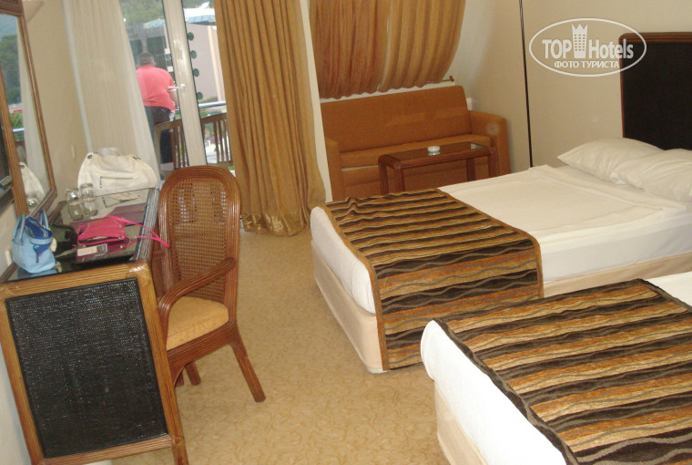 Заезд с 14 по 23 мая 2012 .Приехали я ,муж,дочка 4 г. в 5.30 утра номер получили сразу (повезло),на второй этаж нас проводили и чемодан донесли. Номер выходил на дорогу ,соседние отели и горы.Мини бар с холодильником пополняли каждый день кола,фанта,спрайт,сок ,вода. Кондиционер работал.Сейф нам не пригодился ,так как чемодан с кодом.Постельное белье и полотенца меняли и убирались каждый день. На заметку: глажка - дорого,утюг ,если есть необходимость лучше взять с собой.