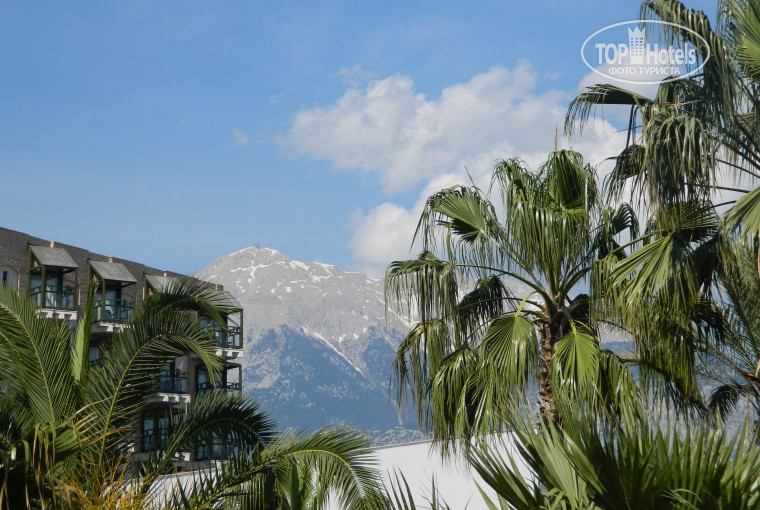 Территория отеля ооооооочень большая и вся утопает в зелени и цветах,плодово-декоративных деревьях,пальмах.Огомное спасибо за это работникам отеля.которые жужжат там днем и ночью как пчелки-трутяги!Два больших бассейна ,2 детских-которые чистятся спец.пылесосом ежедневно.С одной стороны отель окружают горы со снежными вершинами,с другой чистейшее море.Очень красивый отель!