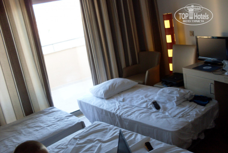 Очень очень испортили настроение размешением мы были 3 раз за границей в турции 2 раз в том году в Египте, но таких маленьких номеров еще не встречали в отелях которых были, стандартный номер это 2 кровати одна большая другая по меньше еще и диван раскладной, но в этом отеле из 3-х предложенных номеров первый номер даже был не убран,во-втором предложенном номере одну то дополнительную кровать поставить было не куда да же сам сотрудник отеля который нес наши вещи сам округлил глаза и сразу стал звонить на ресепшен и и мы опять отправились на ресепшен потом был поход в 3-ий номер. И все таки все номера были на столько маленькие и с одной большой кроватью, что четверым отдыхающим придется ютиться, как "гастрабайтерам" номера реально не расчитаны на четверых они расчитаны только на двоих, но после нескольких походов по этажам с маленьким уставшим ребенком пришлось остаться в 3-ем предложенном номере который находился на 9 этаже он был чуть чуть по больше чем предложенный до этого. Хотя проходя по этажу когда шла уборка видел много номеров с двумя стационарными кроватями большой и маленкой и запасом места, но в таких номерах жили турки при чем в двоем, а не по трое или четверо я ни каких не приязненых отношений к туркам не испытываю, но зачем размещать русских с детьми в малюсенькие номера я не понимаю. После того как я увидел такие номера пошел на ресепшен узнать и обьяснить почему нам дали такой номер мне объяснили, что у нас оплачен стандартный и вы его и получили,а номера с двумя стационарными кроватями это типа номера upgrade и за него надо доплачивать, какой еще upgrade такую чушь слышал в первый раз и что то в колонке описания отеля я не видел ни какого upgrade Только стандарт,Suite и King Suite, а ходить и выбивать нормальный номер уже надоело да и отель был переполнен так, что все было бесполезно. Фото 1-2 как мы ютились проходики маленькие холодильник можно было открыть только отодвигая кровать проход к балкону тоже затруднен стулья бесполезны их просто не куда ставить они так и стояли в углу. И мы были не одни кого так разместили. Номера по площади оставляют желать лучшего. НЕ РАБОТАЛ КОНДИЦИОНЕР ДВА РАЗА ОБРАЩАЛСЯ НА РЕСЕПШЕН, НО БЕЗУСПЕШНО ТАК И НЕ ПОЧИНИЛИ ОН РАБОТАЛ КАК ВЕНТИЛЯТОР НИ СКОЛЬКО НЕ ОХЛАЖДАЛ.Так же минус да наверно многих отелей это входная дверь в номер ни какой шумоизоляции так как она без порога с щелью внизу и все что происходит в коридоре вам очень слышно в номере, буть то плачь детей простые разговоры или возвращающаяся с бара пьяная шумная компания. Не поредставляю, как люди жили в номерах где ресепшен и лобби бар.Кстати примерно с 30 мая лобби бар который должен работать 24 часа стали закрывать около 22 часов вечера из-за жалоб отдыхающих которые жили на этаже ресепшена и он так сказать перемещался этажом ниже примерно под ресторан, но там реально даже было не где посидеть стоит несколько высоких столиков, как в дешевых забегаловках и в доль стены несколько диванчиков но и там тоже начались жалобы. В общем бар который должен работать 24 часа не продуман чтобы для всех было комфортно и кто отдыхает т.е. спит и кто отдыхает бухая. Как все до этого писали номера новые мебель вся новая сантехника тоже и если бы приехали с женой вдвоем то ни каких претензий по номеру бы не было.