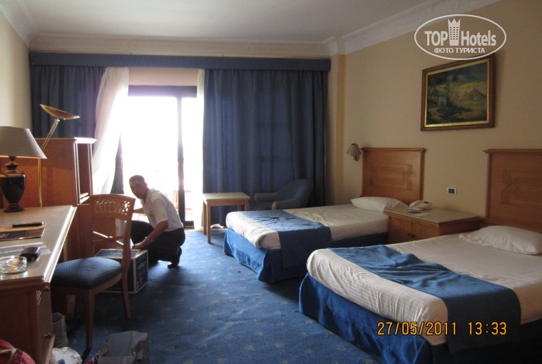 Вылет был в 6 утра из Шеремка. В ручную кладь собрала себе и ребенку купальные принадлежности, до заселения собрались на пляж. Но заселили мгновенно, причем в прекрасный номер на 3-м этаже, сразу видно, что после ремонта, всё чистое, мебель, конечно же, не только что с фабрики, но всё работало, сантехника, вода, розетки (писали, что их надо скотчем прикручивать, это - ложь, розеток вообще много). Сразу сняла на видео панораму номера и вида из него. Но если кто-то живет в шикарных дворцах, то вам явно не сюда. Может в "Барон", где в туалете в лобби всё в изразцах и в золоте? Но там ненавидят русских в любом проявлении (даже прибалтов, похожих на немцев).