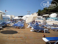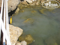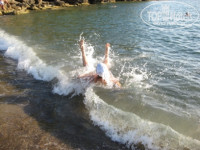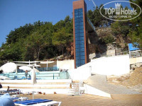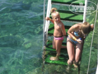 4. Пляж и аквапарк. Пляж-платформа в 3-х уровнях: бар, песочная площадка, деревянный помост. 2 узкие неудобные лестницы в море (см. фото). Сразу глубина. С маленькими детьми купаться проблематично. Зонтов и шезлонгов с избытком. Все новое. Убирать стаканы и тарелки начинают на пляже только с 10-00. Мусор, плавающий в море вообще не убирают. Мало того, под платформу выведена сливная труба с бара, и когда там моют посуду, все ЭТО сливается в море к купающимся!!! (см. фото)