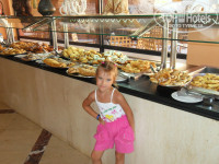 Ресторан нам понравился, еды тоже предостаточно. На завтрак яйца в любом виде, колбаса,сыр, оладьи, вафли и море всякой выпечки, каша овсяная, масло, молоко, сухие завтраки, салат из зеленоватой дыни с яблоком( вкусный), из фруктов порезанные на четвертинки апельсины, грейпфруты, финики, бананы плавающие в молоке. На обед и ужин всегда рис ( для мучающихся животом),жаренный картофель, макароны, из мяса постоянно была курица, говядина присутствовала, на улице рядом с рестораном жарились котлетки и что-то типа люля кебаба, мясо на гриле, курятина, так же в ресторане нарезали кусками мясные рулеты. Салаты с капустой, огурцы, помидоры, свекла, листовые салаты, много овощей в тушеном виде. Супы в виде бульонов и пюре. Пару раз давали арбузы. Вино нам не понравилось, водку не пробовали пиво тоже не впечатлило. Про чай было много написано- это большой косяк. ДАЙТЕ ТУРИСТАМ ЧАЙ НА ОБЕД И УЖИН(воды жалко что ли?).