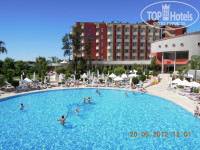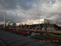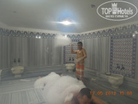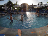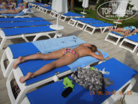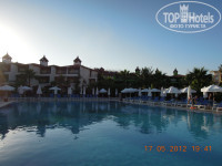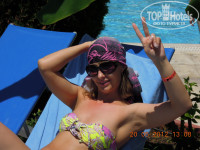 Территория. Она большая – ничего не сказать – она ОГРОМНА! Абсолютно всё в цветах и зелени. Думаю, что дело в том, что это был всё-таки май, ещё нет такой жары, и трава и деревья ещё не выжжена солнцем. Ну и конечно, не без усердных садовников!! – целыми днями что-то подсаживают-пересаживают-поливают-подстригают. Территория просто конфетка! Ночью, после 23 часов все дорожки мыли со шлангов, чтобы не было песка. Я была очень удивлена, но за 10 дней я ни разу не мыла ноги (душ и сауну-бассейн не считаю) – они просто чистейшие, как будто я из номера не выходила! А мы и в Конаклы ходили, и в Аланью ездили… Ну вот нет у них там пыли нашей грязной!!!! СУПЕР! (за нашу страну расстроилась…). На территории отеля четыре бассейна – один – центральный, в нём проходит вся анимация, второй – потише, возле вилл – там хорошо подремать, позагорать; третий – рядом со вторым, небольшой, детский и четвертый - крытый - на территории спа-центра. Среди вилл есть уединённое местечко – небольшой фонтан, вокруг которого расставлены скамеечки – можно посидеть и отдохнуть. Для детей: мини-клуб, куда можно сдать ребенка работает с 10:00 до 12:30 и с 14:30 до 17:00, в 21:00 – мини-диско, игровая площадка рядом с ним, и игровая площадка на пляже.