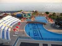 Территория огромная-зеленая. Три бассейна, один при нас не функционировал, один бассейн закрытый, две горки. Пляж большой, места всем хватало. Кто загорал на лежаках, а кто - на песочке, на полотенцах-как на российском юге). Шезлонгов катастрофически не хватает, не говоря уже о матрасах!!!!Российские туристы занимали шезлонги, начиная с 6.45 утра! И бронировали их на всеь день! Если уходят, оставляют на них вещи. Это все просто добивало, как будто лежаки – это их монополия и другим не хочется лежать на них!!!!!Пляж песчано-галечный, вход в море – мелкая и средняя галька. Есть пирс, с которого можно прыгать и просто спускаться в море. Море чистое.