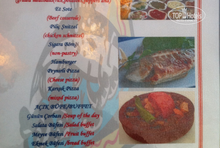 Стоимость 20 у.е. с человека. Приходишь – официант сперва уточняет, какое именно меню нести – рыбное или турецкое – все готовится на одной кухне )