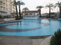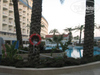 Вчера вернулись из отеля. Отдыхали с 13 по 23 июня двое взрослых с двумя детьми (9 и 10 лет). ЗАСЕЛЕНИЕ И НОМЕР: заселили нас минут за 10, договорились С Олесей на семейный двухэтажный номер с видом на бассейны и море за коробку конфет. Ехали с пометкой в ваучере "ХОНИ МУН", что означает молодожены). Сразу в номер принесли бутылку вина с фруктами...Было приятно...Чуть позже донесли, халаты, тапочки, шампуни, бальзамы, щетки, пасту, расчески, пилочки, шапочки, салфеточки...Впрочем, пополняли ванные принадлежности три раза.На кровати положили открытку с поздравлениями и подарком в виде завтрака в номер, чем мы воспользовались позже.Убирали номер хорошо, из полотенец делали цветочки и лебедей, чаевые оставляли только пару раз. Нам дали 2 карточки, так что кондиционер работал, когда мы этого хотели, кстати, работает он только при плотно закрытом балконе. Слышимость в номере только в санузле, в 24 часа становится тихо на улице, соответственно и в номере, до этого времени слушаем анимацию, дискотеку, караоке, живую музыку...всё по очереди))). В общем, номер супер! ПИТАНИЕ: Сразу скажу, набрала три кило!)))Завтраки дети обожали, заставлять не пришлось: гренки, омлеты с сыром, колбасой, зеленью, яичница, варенные яйца, оладушки просто улётные!!! С ними дети объедались шоколадом, а мы мёдом и вареньем малиновым) Был мёд в сотах, джемы разные, варенье, сосиски двух видов, сыры разных видов, выпечка супер, овощи, орешки, хлопья, рахат лукум, кашки молочные, колбаска, разные йогурты,много еще чего, это основное. Обедать можно на выбор в ресторане, в баре на пляже (картошка фри, шаурма из курицы, говядины, баранины, хот-доги, фрукты есть, салатики, из напитков на пляже пиво, чай, кофе, айран, соки (юпи), фанта, спрайт, кола, простая чистая водичка)), в баре возле бассейнов (пицца двух видов, манты, курица в панировке вкусная, картошка фри, рыба на гриле, макароны с соусом обжаривают при Вас...фрукты, овощи, напитки алкогольные и безалкогольные...Вообще-то блюда повторяются, но это не напрягает, наоборот, знаешь, что берешь...без сюрпризов))) На ужин блюда не перечислить, но всё вкусно, один раз только попали на говядину, в которую не смогли "вбить зуб)))так ее и оставили на тарелке...и один раз в нектарине ребенок нашел кучу мурашек, но мы не запаривались, показали официанту, чтобы персонал знал про недостаток, и забыли про это. Клубнички не попробовали, но всё это мелочи!!!! Нас угощали арбузиком, черешней, апельсинками, виноградиком зеленым, абрикосками, нектаринками, банашками, яблоками, грушами, киви, зелененькми штучками неизвестными)На ужине стол от входа в ресторан справа: лепешки с начинкой, картофель печенный(вкусно!), кетчуп, майонез, чебуреки, беляши, овощные блинчики, всегда сотэ из курицы, утки, баранины, говядины или телятины, индейка, потом основное блюдо говядина либо ягнятина либо баранина,рыба. Всю эту очередь от лепешек до основной вкуснятины приходилось каждый раз отстоять, если только не влезть по наглухе, как это делали немцы через голову. Пока стояли в очереди, можно было попасть под брызги от жарящегося на огне лука)))))Этот момент- единственный минус, немного не продумано, когда много людей, а их было очень много с 19 числа, мы даже расстроились, т.к. если кетчуп не взял, прийдется растолкать очередь и взять нагло... Я думаю, когда отель полностью не заполнен, этого нет).Пару раз вид