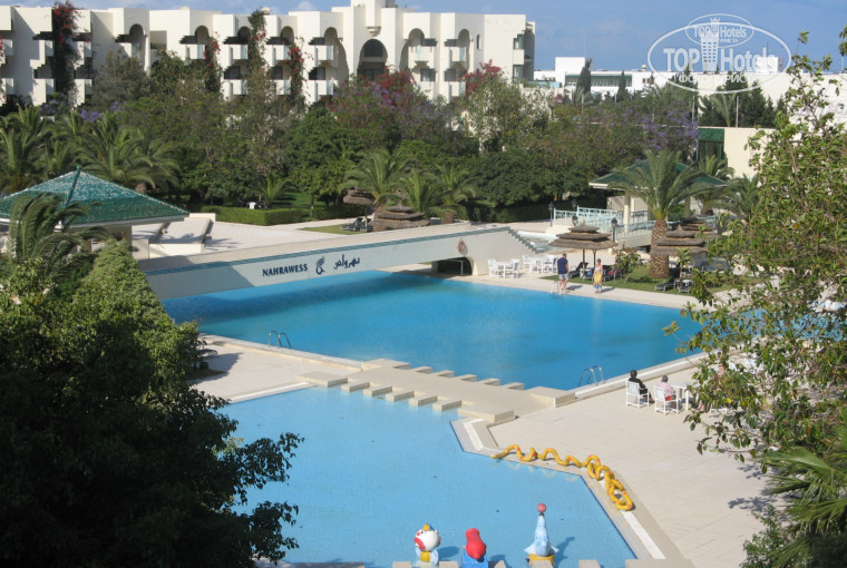Отель имеет большую территорию с огромным количеством растительности (пальмы и различные фикусы-пикусы просто огроменные), а также большие бассейны: 1 детский бассейн, 1 крытый, 2 для взрослых (один у моря с морской водой) - это большой плюс. Но отель старой постройки и видно, что следят за ним неважно, на многом экономят. Из дневных развлечений для себя выбрали пляжный волейбол, море и бассейн с морской водой, настольный тенис. Тренажерный зал и сквош корты до того обшарпанные, что и заходить не хочется. В крытом бассейне дно просто мхом обросло... аква и степ аэробика - позорище((