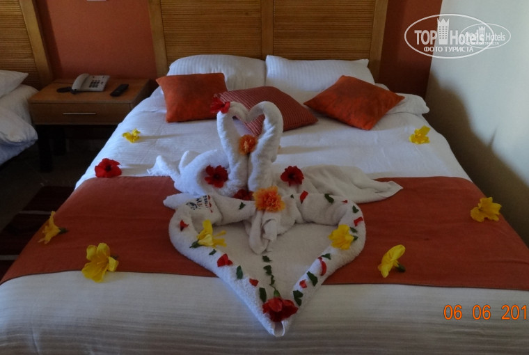 Так как нас было 2 пары с детьми, хотелось иметь номера рядом, ну или хотя бы в одном корпусе. Положили по 20 долларов в паспорт и получили всё как хотели! (1-ый корпус), номера рядом. Но.... В номере у друзей было 2 кровати, а у нас одна. Для дочери ( ей 16) предложили раскладушку. Предлагали и сами смеялись над своим предложением! Вообщем бегали мы по номерам минут 40 (Друзья остались в своём номере на втором этаже, их всё устроило), а мы согласились на номер на первом. Номер был не подготовлен. Через пол часа помыли, принесли (почти) всё что нужно. Ну и ладно! Нормальный номер (1004), большой, кондиционер не гудел (в соседнем ревел,как паровоз), холодильник (не работал) поменяли, воду принесли. Сейф тоже не работал. Удалось поменять его только на 6-ой день. Ну да ладно. Наверное кому как повезёт!