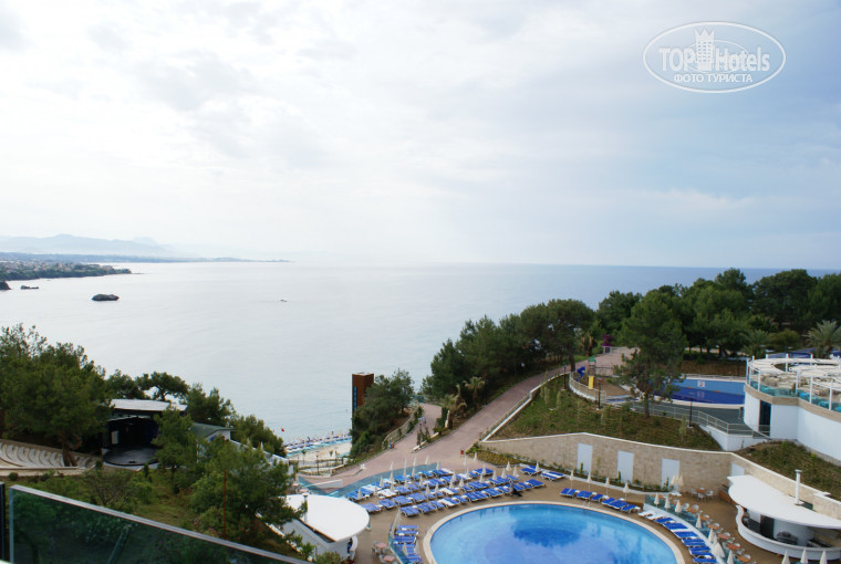 Территория - бассейны, прогулочные дорожки, бары, столики, лежаки. Погулять по сути негде.Все дорожки на территории отеля под углом, ты или идешь в гору, или спускаешься с горы. Я понимаю, что отель расположен на скале, но факт остается фактом... Дети через одного ходили с разбитыми коленями, локтями, лбами, забинтованными руками и ногами. Да и взрослые тоже, видимо, сказывалась система ultra ALL))) Но в целом царит атмосфера релакса, бассейны, море, солнце!
