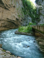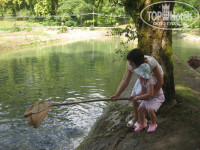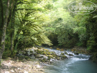 Форелевое хозяйство. Ловишь рыбу сачком, потом тебе ее жарят. За форелевым хозяйством очень живописная горная река, деревья возле реки покрыты мхом, свисающим с ветвей.