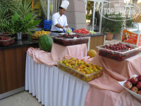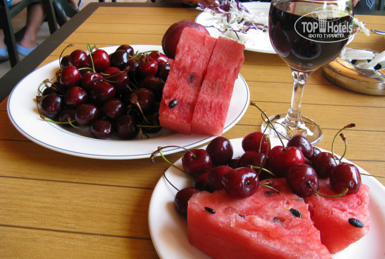 Питание: Каждый день черешня и в обед и на ужин, персики,яблоки,дыня,арбуз(сладкие) много рыбы,мяса,десерты,салаты, вежливые и быстро обслуживающие официанты. Для детей был специальный уголок со всякими смесями и кашками. В отеле были дети даже месяцев 3!!