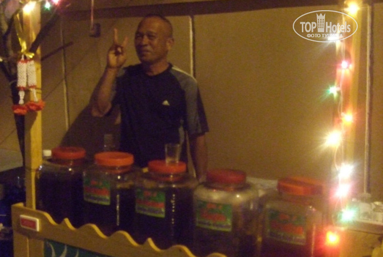 Знаменитый суп Том-янг(180 бат) мне больше всего понравился в ресторане Евразия(выходите из отеля и прямо по улице,чарз 100м слева ресторан).Кстати в этом ресторане душевно готовят.Все блюда просто класс.Поесть будет стоить 400-500 на человека.Ещё одна фишка этой улицы-тайский самогон.Чуть выше ресторана,справ а,вечером приезжает торговец на прилавке у него стоят 5л бутыли с тёмной жидкостью.Рядом стол и 2 лавки.Короче можно там распивать,можно брать с собой.Вещь бесподобная.Всё с травами,т.е.лечения для…50гр напитка стоит 10 бат.Чем больше тара,тем дешевле.Фото целителя выкладываю.Да не заростёт народная тропа!Жёнам и подругам не выдавать!!!Спалят ведь мужика!!!
