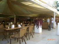 Начну со столовой. На многих фото отеля видно, что ресторан находится на последнем этаже главного корпуса на террасе. Это не так. Ресторан находится на улице (на фото). Конечно первые пару дней мы шли туда, как на каторгу. Потом привыкли. Там дикая жара, работают мощные вентиляторы, которые гоняют раскалённый воздух и к тому же жуткий рёв. Вобщем ощущаешь себя, как на аэродроме.