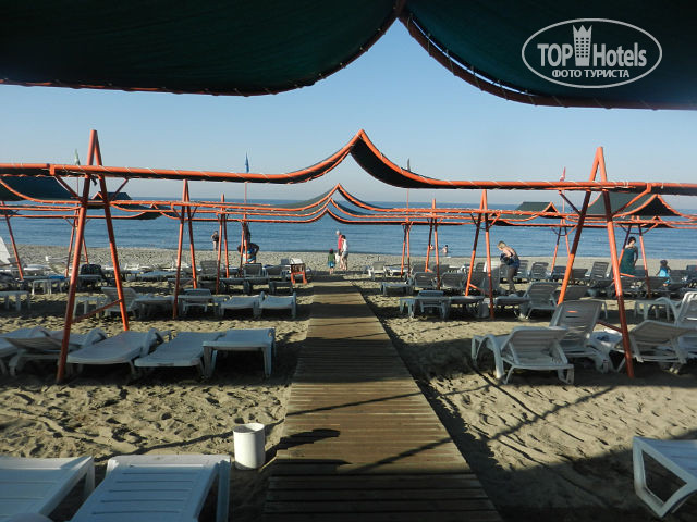 Пляж от ресторана находится на расстоянии около 300 м. На пляже работает с 11 до 16 часов бар - газ.воды, пиво, вино, фастфуд. Голодным не останешься. Лежаков на всех не хватает, но если долго не спать и сразу после завтрака или обеда пойти на пляж - лежаки ваши. На пляже песок, но при входе в воду крупная галька, входить не очень комфортно. Дно у моря как единая каменная монолитная плита.