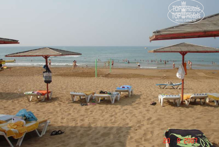Питание: с гарнирами у них БОЛЬШАЯ проблема, были только картошка фри и рис, макароны пахнут хлоркой, есть не возможно. Горячих блюд много: плов из баранины, индейка под соусом, цыплёнок, кура-гриль, форель, лазанья, говядина, жаренные крылышки и тд. В зале только один вид супа(не съедобный), много разных салатов, зелени, соусов, огромное количество фруктов-виноград, арбуз, дыни, груши, яблоки, персик, инжир, слива. Очень вкусные разнообразные десерты. Ежедневно выдают мороженное в баре у бассейна с 15.00 до 17.00 с огромными очередями, кто не успел, тот опоздал, мороженое "Альгида"(вкусное), бабка пикет целый день блины у моря с сахаром, творогом или фаршом и иногда картошку в мундире запекает, также с очередями, но меньшими чем за мороженным. Соки только разводные типа "Юпи", свежевыжатые за доп. плату, много лимонада-пепси, фанта, 7UP и тд. Есть ещё ресторан около моря, но выбор там очень скудный, поэтому все питаются в главном.