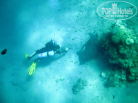 2. черепаха спит на дне (за буйками, у кораллового холмика) а рядом аквалангист из Хилтона с видео камерой. На спине у черепахи видна рыба-прилипала "ремора".