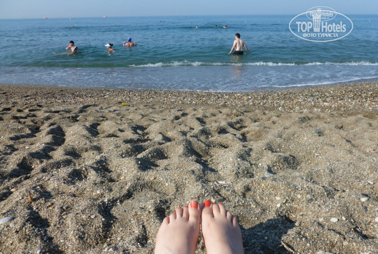 На пляж можно дойти за 3 минуты неспешным шагом. Там тоже много шезлонгов и на всех хватает. Море ласковое. Во время нашего пребывания только один день оно штормило и было немножко мутным но это только у берега, если плыть чуть дальше по направлению к буйкам, то там вода чище. Пляж как и написано песчано-галечный. Дно местами большие камни, но мы нашли место где была только мелкая галька и купались только там. На пляже есть водные виды спорта, мы катались на Банане, было клево, стоило 10 долларов на человека. Потом можно было купить фотографии сделанные во время катания на Банане.