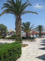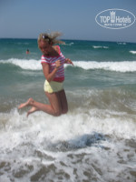 Территория отеля большая, но по ней особо не гуляют, все сосредоточено на дорожке от отеля к пляжу, мимо бассейна. Бассейн средний, лежаков не очень много, но как везде на них бронь в виде полотенец от тех кто любит вставать пораньше. Пляж большой, чистый, линия лежаков с зонтиками (платно по 2,5 евро) а перед ними ближе к морю широкая полоса песка, где можно лежать на полотенцах. Вход в море хороший, песочек, но правда есть немного мелкой гальки которую к берегу сбивают волны. Глубина постепенно увеличивается. Море прохладное.