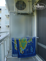 На балконе: стол, стулья, сушилка, москитная сетка. Перегородки между балконами из матового стекла до пола. Если нужна пепельница, ее надо брать внизу в баре в лобби.