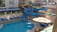 Но это нам совсем не помешало прекрасно отдохнуть. У отеля маленькая уютная территория, много растений, прекрасный большой бассейн, есть горка. Время работы бассейна и горки правда немного расстраивало, но это мелочи, ведь на море приехали. Средиземное море прекрасно!! Пляж у отеля не самый лучший, песок с мелкой и крупной галькой, при входе вводу в некоторых местах вулканические плиты, что не очень удобно. Вода кристально чистая, но как и везде, когда поднимались слишком большие волны, в воде плавал мусор (веточки, листочки и пр.). Волны есть всегда, но большие мы видели только 2 дня)