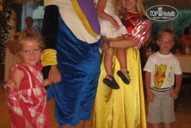 Анимация: на взрослую мы не ходили. По детской анимации: сразу предупрежу родителей - не думайте, что с Вашими детьми будут заниматься круглосуточно. Клуб работает два раза в день по 2,5 часа + вечерняя программа. Если отдаете ребенка в первый раз в клуб - уточните до скольки будут аниматоры в клубе, т.к. по окончании отведенного времени они закрывают комнаты в клубе и уходят. Дети останутся без присмотра. Я ехала быть с детьми и меня такой режим устраивал. Детей приводила часам к 11.00, как раз когда солнце уже сильно припекало. Дети могут бесплатно смотреть мультики, рисовать карандашами и красками, лепить. Аниматоры проводят бесплатные занятия - учат рисовать, лепить, собирать бусы или браслеты. Часто бывают платные занятия: рисование цветным песком, рисование красками на футболках или тряпочных сумках. Устраивались дни тигренка, индейца, приведения и т.п. (это бесплатно). Мы участвовали один раз и все понравилось, получились забавные фотки. Омрачился такой день только одним - краска вместе с солнцем дала ожог на лице у одного ребенка, пришлось обращаться к врачу, через 2 дня - как ничего и не было. Так что - будьте осторожны. Очень хочу отметить отношение аниматоров к детям - оно отличное. С детьми никто не сюсюкает, но именно это детям и нравится. Дети чувствуют, когда к ним с душой относятся! Моя младшая дочка 3 лет - Рита - узнавала аниматора Алену на любом расстоянии и бешено мчалась к ней! Очень благодарна я этой девушке - деток 3 лет без сопровождения взрослых не берут, но бойкая девочка была на равных со старшими и ее брали в клуб без меня: Алена от нее не отходила и учила и рисовать, и бусы собирать. Ритуля до сих пор говорит: "Моя любимая Алена!" Еще в клубе впервые был опыт постановки детского шоу, куда мог записаться любой желающий ребенок от 4 лет. Мои старшие выступали. Конечно, это самодеятельность, но с учетом того, что на подготовку было всего три репетиции по 20 минут - я считаю, что постановка удалась! Самое главное детское развлечение - это вечерние танцы: все дети с аниматорами на сцене амфитеатра танцуют. Взрослые к концу отдыха с ума сходят от одной и той же музыки :) А дети в восторге!