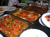 Питание хоть и однообразное, но выбор огромный. Всегда есть основное блюдо - очень вкусное мясо/курица/рыба. Стандартное меню: 2-3 вида мяса в различных соусах, курица под соусом, сыры в ассортименте, колбасы, 3-4 вида гарнира, котлеты, 5-6 готовых салатов, горячии закуски, свежие овощи, листья, заправки к салатам, соусы, фрукты (яблоки, арбузы, персики, абрикосы, виноград, дыня, сливы), 6-7 видов десертов, свежая пицца, 2 супа, булочки. Напитки: чай, кофе, сладкие напитки - малиновый, лимонад, пепси, фанта, спрайт, компот на завтрак, вино красное/белое, пиво, самбука, джин, водка, ликеры в ассортименте, соки на пляже бесплатные, в столовой свежевыжатые платные. Еды всем хватает. Персонал внимательно следит за опусташением тары с едой и быстро добавляет свежую. Столы буквально облизывают - грязную посуду вырывают из рук, улыбаются, желают приятного аппетита, при первой встрече всегда желают хорошего дня.