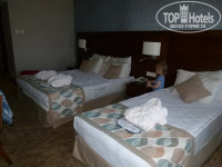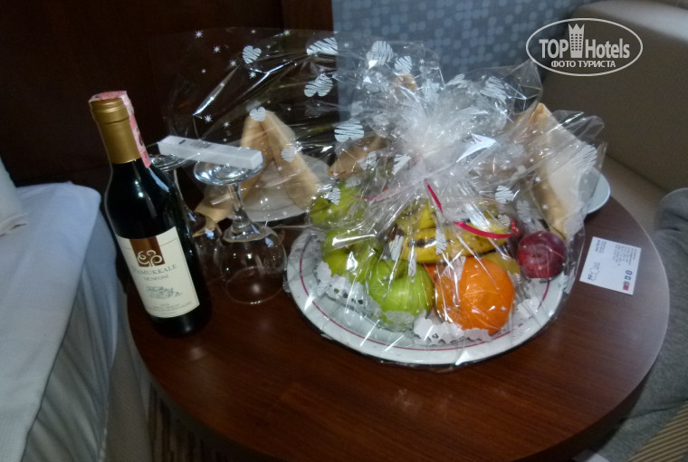 В отель приехали часов в 10 утра, нас сразу оформили, одели браслеты и отвели на поздний завтрак. После завтрака немного прогулялись по территории, потом пошли в Lobby Bar, решив что раньше 13.00 даже спрашивать не будем готов ли номер. В 12.15 нас нашла представитель нашего турагенства и сказала что наш номер готов. Поначитавшись отзывов на этом сайте про то, что русских селят не выше первого этажа, были приятно удивлены когда заселили в номер на третьем этаже главного корпуса с видом на бассейн, театр и море. В номере ждал сюрприз от отеля в виде бутылки вина и тарелки с фруктами (за регистрацию в графе "Я еду" на этом сайте), мелочь, а приятно. В этот же вечер на вечерней анимации перечислили и поблагодарили всех зарегистрировавшихся здесь и пригласили на следующий день в Lobby Bar на фуршет, но мы на него не попали, т.к. не смогли вытащить ребенка из моря.