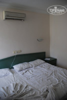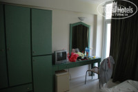 Старая мебель зеленого цвета, кровать 1,5 со старым жестким матрасом, давящим бока, и 1 спальная с нормальным матрасом, две тумбочки прикроватные, стол, стул, телефон, работает старый телевизор (2 канала российские) и кондиционер.