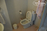 В ванной старое объеденное коррозией зеркало с полочкой под ней раковина, на кране нет аэратора и вода хлещет внезапно во все стороны, 2 стакана, фен, душ и унитаз со следами многочисленных ремонтов. Шампуня нет - только жидкое мыло в контейнере у раковины. Освещение плохое - 1 лампа в 40 ватт.