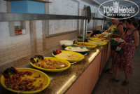 Набор блюд однообразный, меняют 1-2 блюда. Фрукты: яблоко, арбуз, дыня, алыча, апельсин - все. Выпечка: булочки и крендельки, хлеб. Десерты однообразные: бисквит со сливками и разной посыпкой, пудинг и пропитанные сахаром "печеньки". Мясо: курица, котлеты из говядины, индейка. Утром жарят яичницу с колбасой и складывают в большой лоток, подходи-насыпай, и есть всякие сушеные мюсли, хлопья с молоком. Соки все из концентратов типа "ЮПИ", газированные напитки: пепси, кола, фанта, вода. Также чай, кофе из автомата, вода простая.