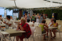 На пляже есть навес, под которым стоит стол для любителей настольного тенниса с ободранными ракетками без шара, и любителей игры в дартс без дротиков в раздобанную мишень.