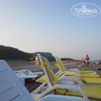 Пляж-галька не очень крупная. На пляже всегда есть места.(Саркан следит чтобы места не занимали туристы из других отелей.) Тоже очень добродушный улыбается всегда! Море отличное было теплым, прозрачным,чистым!На пляже есть бар, раздевалка, душ, туалет(правда платный 1$),напитки типа "юппи" и вода.