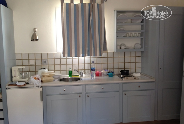 Отель спроектирован в виде греческой деревеньки. Много улочек и 2-3-этажных домиков, в каждом по 4 номера. Все номера, насколько я понял однотипные. У нас был двух-комнатный, но смотрел у других ребят, номера по размерам и наполнению такие же, только без перегородки. В каждом номере вне зависимости от этажа есть совя терасса со столиком и креслами, где удобно и приятно посидеть вечером. Телики маленькие, но рабочие. Интерьер простой, скромный, но в то же время довольно милый. Все чисто, убирали каждый день, на чай оставляли 2 евро. Есть кондиционер, холодильник, кофеварка (не пользовались), тостер, плита, кастрюли, сковордка, посуда. Неплохо в общем. Подавляющее большинство домиков не имеют вида на море. Есть только одна улочка с видом, хотя мы от этого сильно не страдали. Детскую кроватку и даже горшок предоставили без проблем.